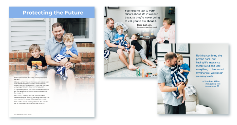 It’s very exciting news! That means your story was selected because it conveys an important message that we’d like to share to help educate others. We will work with all participants, including the financial professional and client, to schedule a 2-day production to capture the story in video and photography. We’ll share the story in a variety of ways such as videos, flyers, email templates and social-media graphics. Here is an example of the types of content: