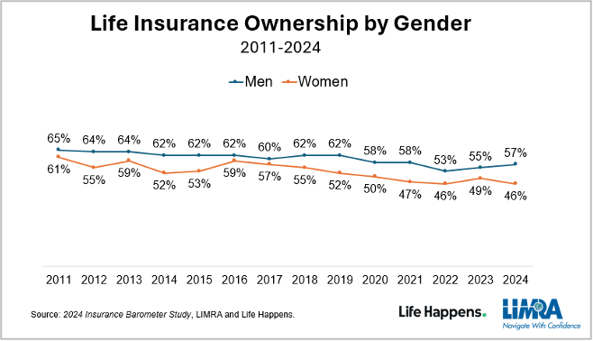 In 2024, women were less likely than men (46% versus 57%) to report having life insurance. This 11-point difference is the largest it has ever been over the 14 years of the study. This is not due to lack of awareness about their need for life insurance. Forty-five percent, or 54 million women, say they live with a coverage gap and more than a third (36%) — and nearly half of younger women — say they plan to purchase life insurance in 2024.