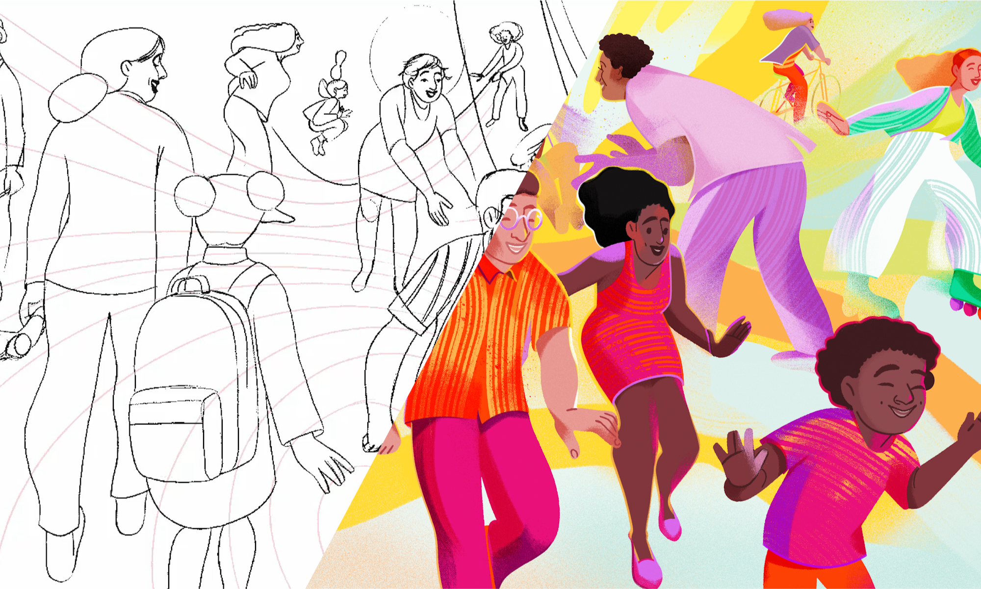 Eugenia: I wanted to create characters that weren’t exclusionary. That’s part of the responsibility of making images: You’re creating worlds. It’s about a group of families that coexist together; they’re having joy in a very regular day. The color yellow is joy to me, it’s the color of the sun. When I see it, it feels like a day that you don’t want to end… those summer days that are just perfect and you think, “I wish this day would last for a very long time.”