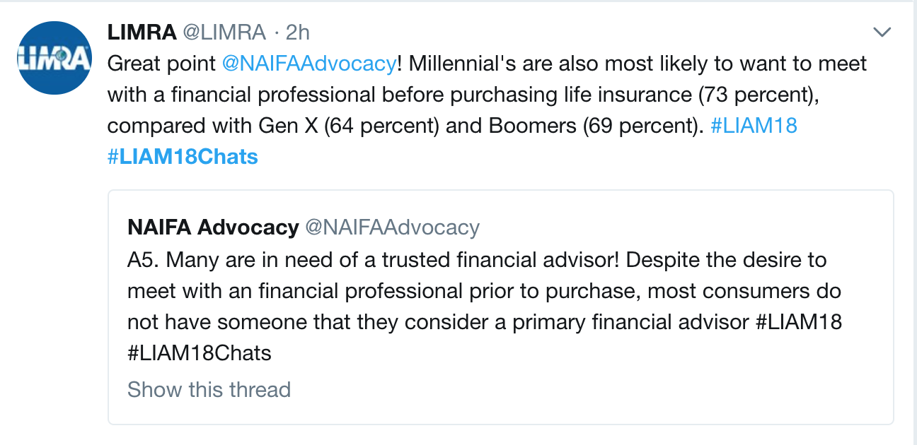 LIMRA points out Millennials ARE hip to getting help–more than their elders. Good for them. NAIFA‘s tweet has a great solution if you don’t have an advisor currently and you can also find someone in your area using our Agent Locator.